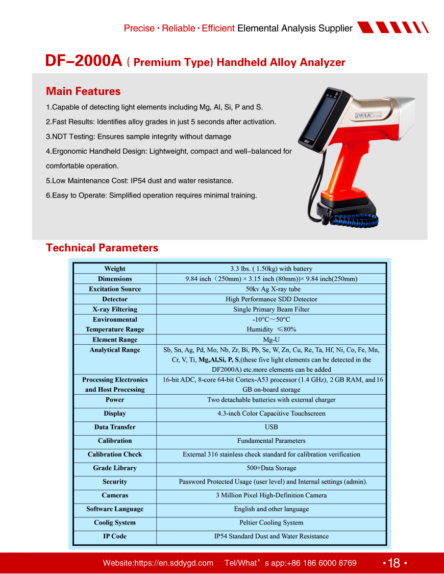 | Analytical Range | Sb, Sn, Ag, Pd, Mo, Nb, Zr, Bi, Pb, Se, W, Zn, Cu, Re, Ta, Hf, Ni, Co, Fe, Mn, Cr, V, Ti, Mg, Al, Si, P, S (these five light elements can be detected in the DF2000A) etc. more elements can be added |