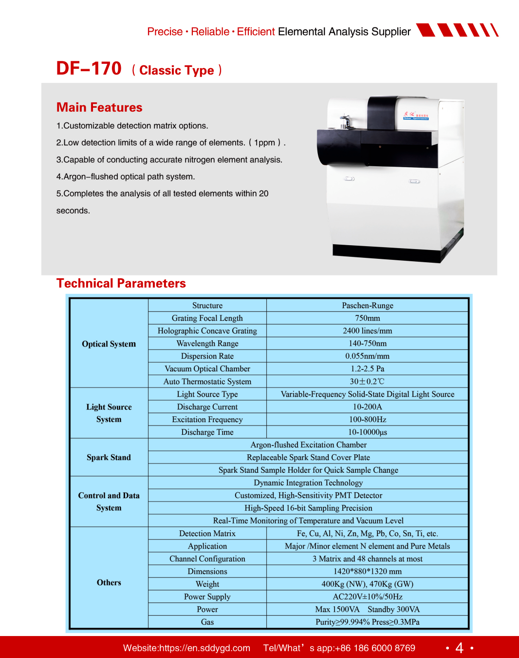 1) The DF-170 OES is mainly used for analysis up to 3 metal matrix composites. Digital light source with customizable excitation parameters is available for various metals, enabling more stable analysis.